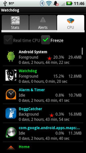6. Monitor Tasks And Data Usage In mobile, battery is gold and running out of juice is never an option. In order to quell the uprising of rebellious, battery-hungry apps, you need to use a task manager. Watchdog Task Manager is one such beast. It will notify you if an app goes astray and uses up too many CPU cycles. You can even give it the thumbs down, Roman emperor-style, and kill the wayward app if it displeases you.
